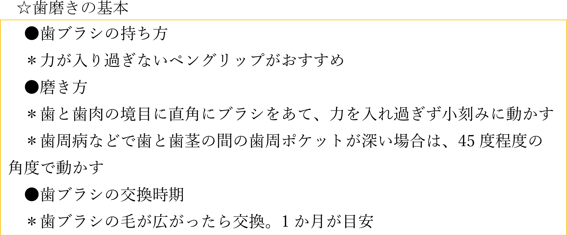 *歯ブラシは毛先を歯と歯肉の境目に直角に当てて、軽い力で小刻みに動かし1本ずつ丁寧に磨くのが基本。1回3分以上が目安。
